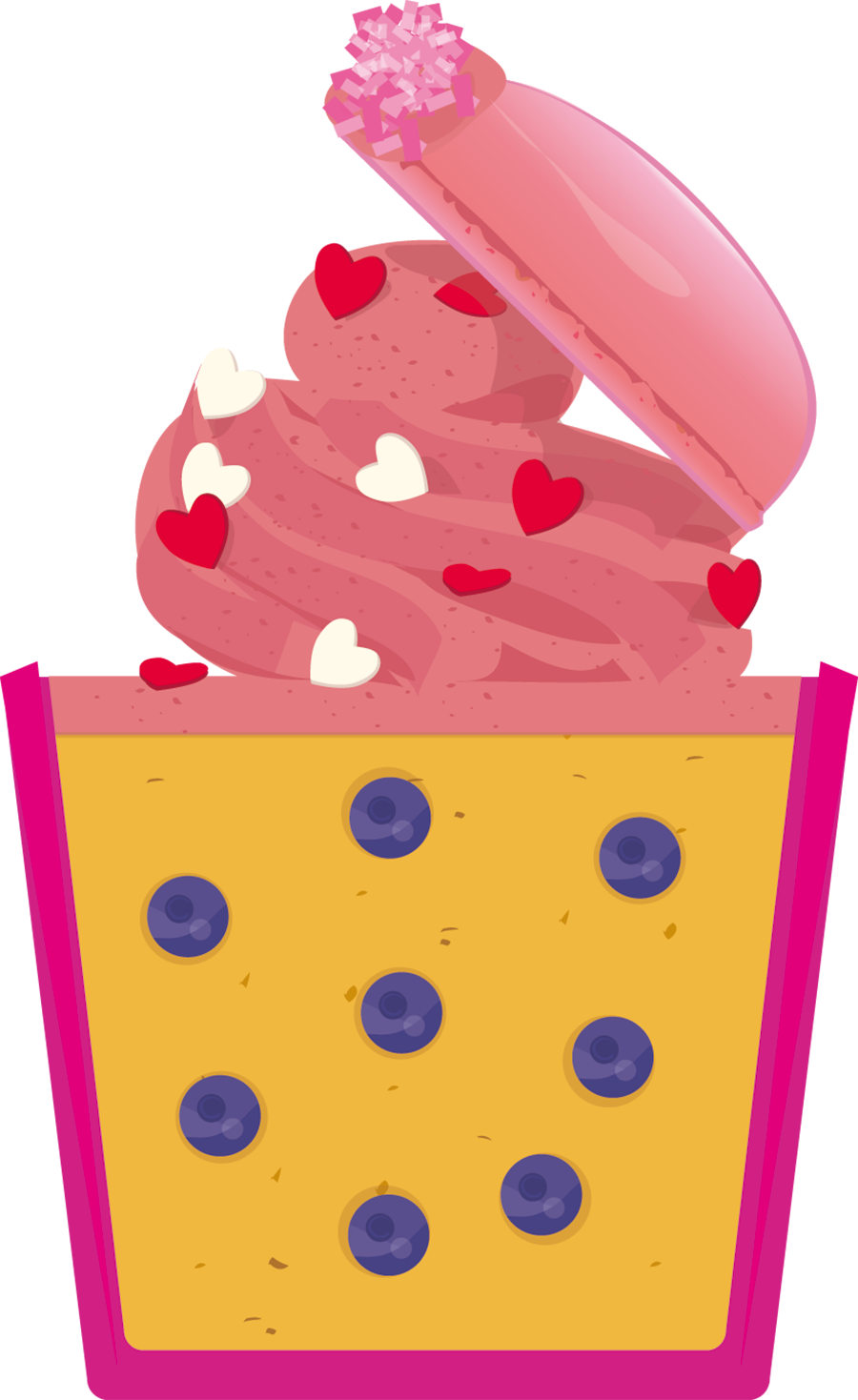 Décorer les Cupcakes avec la crème au beurre, les petits macarons violets, les petits cœurs en sucre et le sucre coloré.