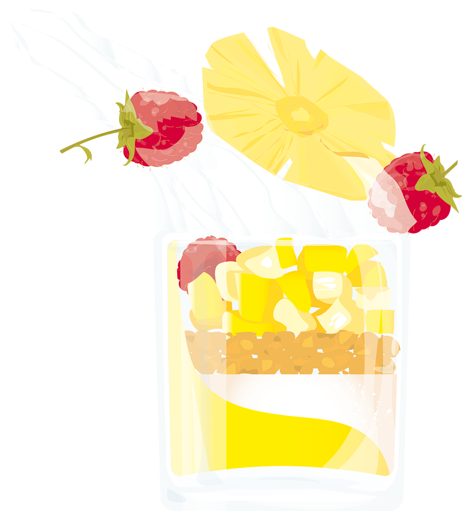 Chemiser le fond de la verrine avec la gelée à la passion. Refroidir. Répartir le coulis à la noix de coco dans le fond de la verrine. Ajouter le crumble à la noix de coco. Parsemer la salade de fruits. Décorer avec les chips, les framboises et l’isomalt.