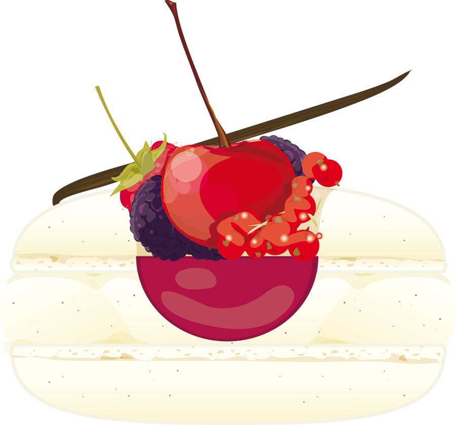 À la poche, dresser des boules de crème légère à la vanille sur le tour du macaron. Ajouter au centre la gelée de fruits rouges. Disposer la couronne de macaron et fermer le centre avec le reste de crème légère à la vanille. Décorer.